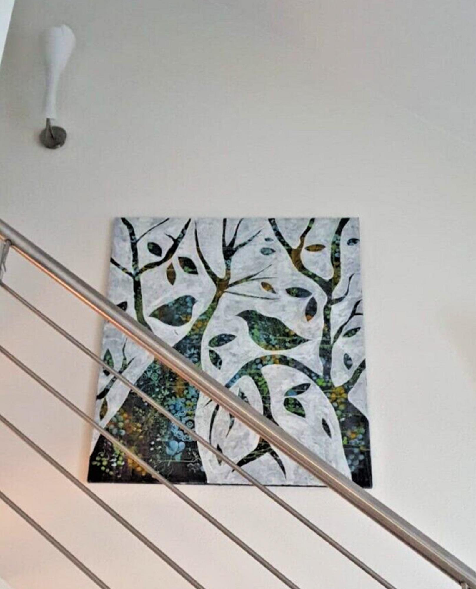 „Vögel im Wald“ – Abstraktes Acrylbild Acryl auf Leinwand Malweise: Negativtechnik Größe: 100×120 cm Preis mit Schattenfugenrahmen 490,00 €