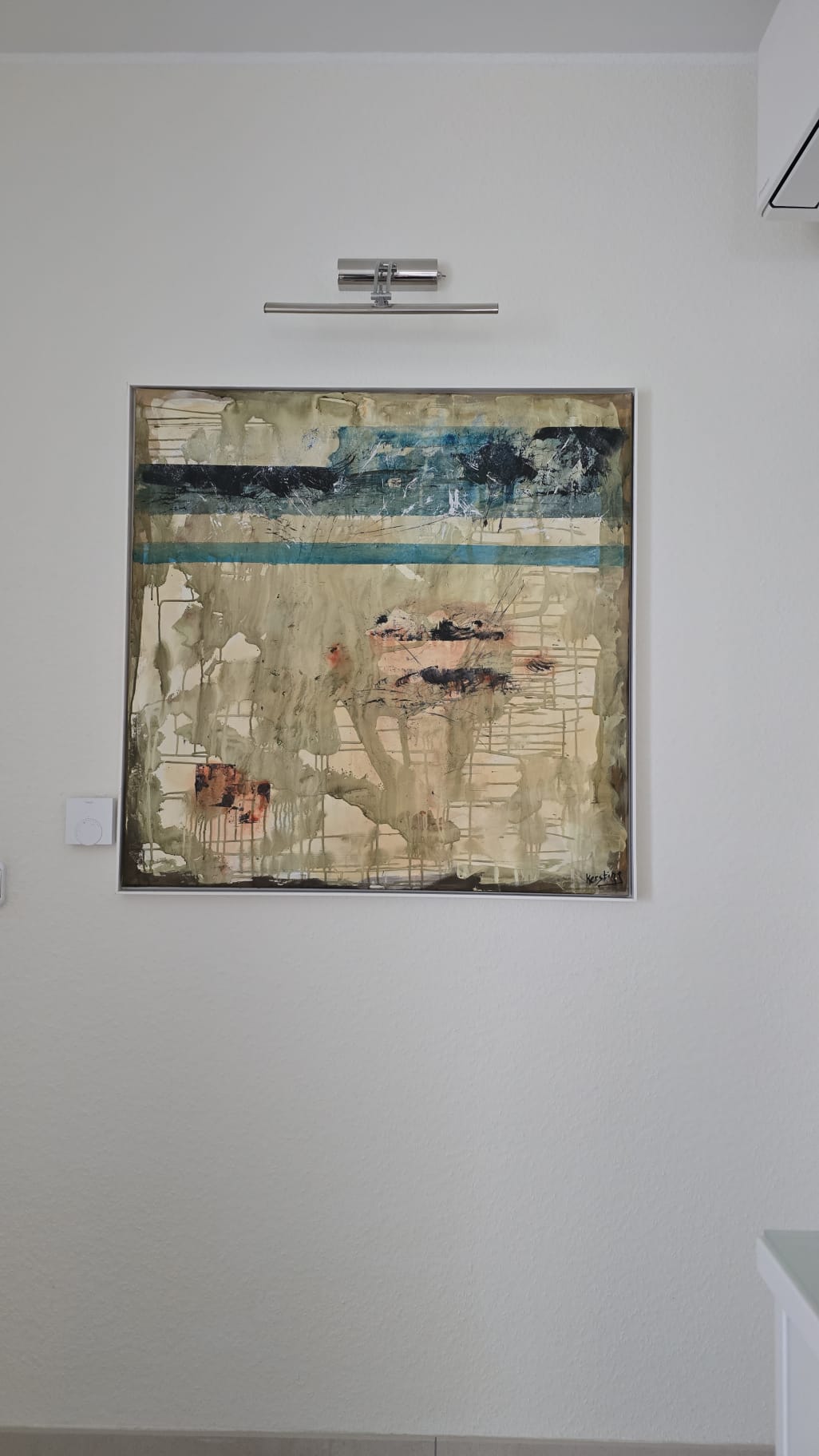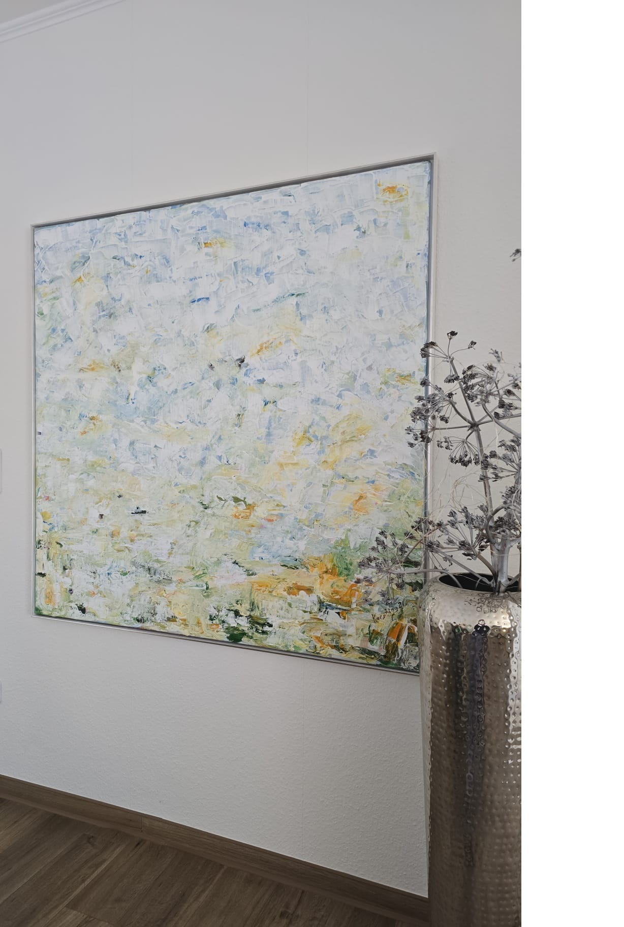 Abstraktes Acrylbild in Spachteltechnik, Größe ca. 1,2×1,2m. Das Werk wird in einem hochwertigen Schattenfugenrahmen Weiß/Silber präsentiert